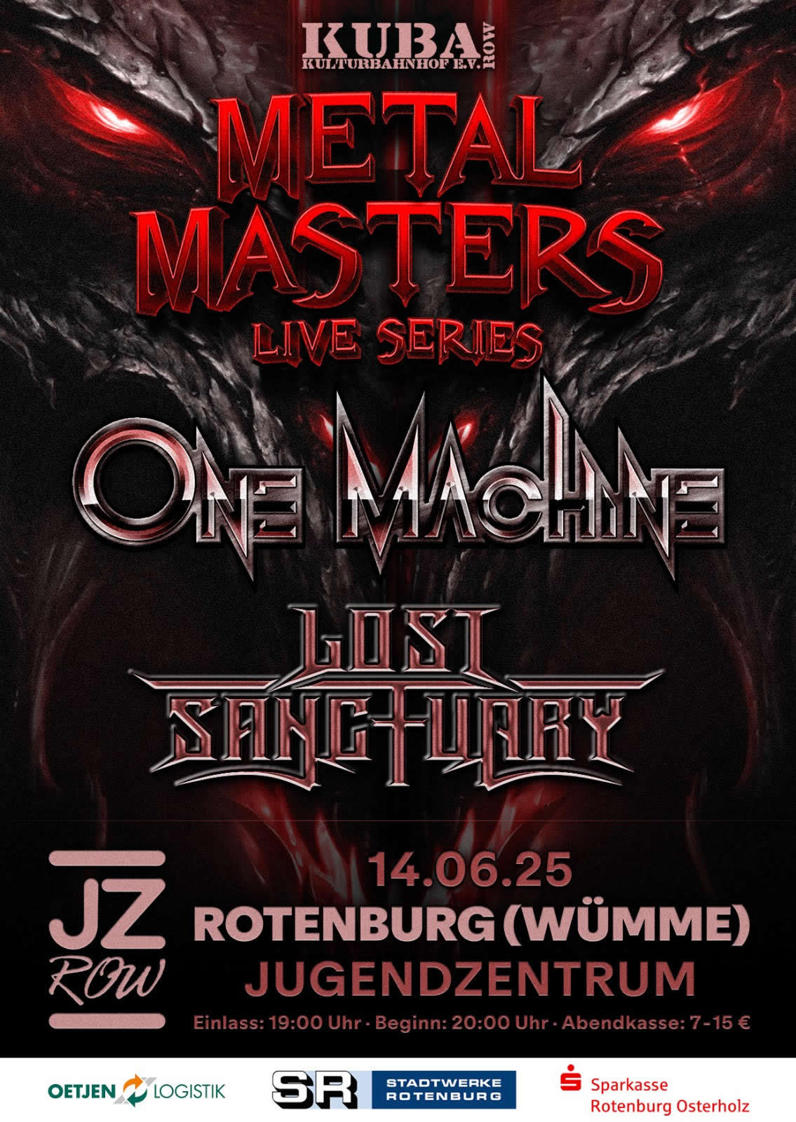 KuBa (Kulturbahnhof Rotenburg e.V.) präsentiert am 14.06.2025: Metal Masters Live - One Machine & Lost Sanctuary im JUZ (Jugendzentrum Rotenburg). Einlass ist um 19.00 Uhr. Beginn des Events: ca. 20.00 Uhr.