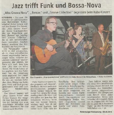 Die in Rotenburg mittlerweile bestens bekannte Sängerin Evelyn Gramel bringt ihr Quintett "Miss Groova Nova" mit und wird mit der südamerikanischen Rhythmik des Bossa Nova und Samba für Stimmung sorgen. "Benson", die zweite Band des Abends hat sich nach dem amerikanischen Jazzgitarristen George Benson benannt und der Name ist Programm: Klassiker wie "On Broadway", "Weekend in L.A.", "Affirmation" und viele anderen bekannten Stücken (nicht nur von George Benson) sind wohl selbst den eifrigen Rotenburger Disco-Gängern der 80er wohl bekannt. "Groove Collectio"n aus Rotenburg haben sich mit Gastsängerin Evelyn Gramel und ihrem Latin-Funk Mix vorgenommen, den Saal des ehrwürdigen Heimathauses zum Kochen zu bringen.